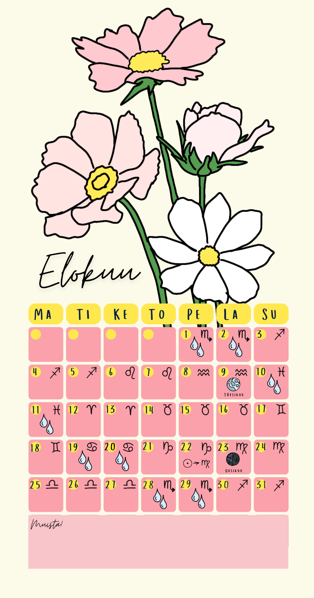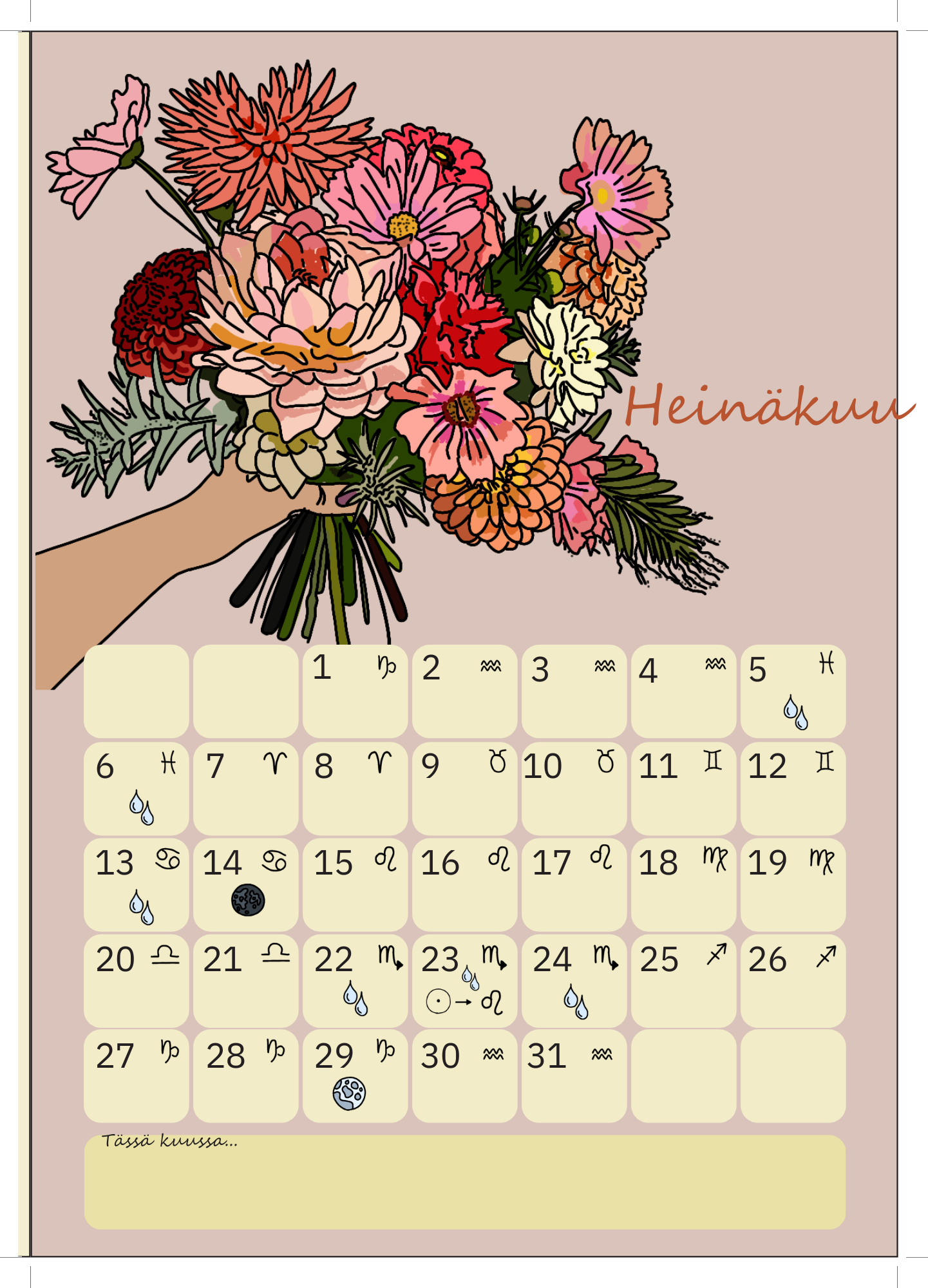 Kalenteri on kaunista kartonkia ja sisältää 12 erilaista kukkiin liittyvää taidepiirrosta. Mukana on kuunvaiheet (merkki sekä uusi- ja täysikuu) sekä vesipäivät, jolloin on erityisen hyvä ajankohta kastella viherkasveja. Lisäksi löydät jokaiselle kuukaudelle tilaa omille muistiinpanoille.
